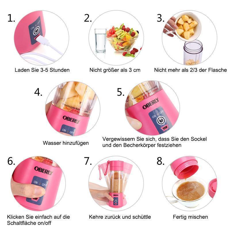 Tragbar USB Elektrischer Entsafter kommt in einer kleinen Größe, die bequem zu tragen und zu verwenden ist. Darüber hinaus können Sie den Entsafter einfach mit einem USB-Kabel aufladen, das an Ihrem Laptop, Auto USB-Port, Powerbank oder an jeder Steckdose angeschlossen ist. Eine eingebaute langlebige Batterie ermöglicht Ihnen, frischen Saft zu machen, wann immer Sie brauchen.