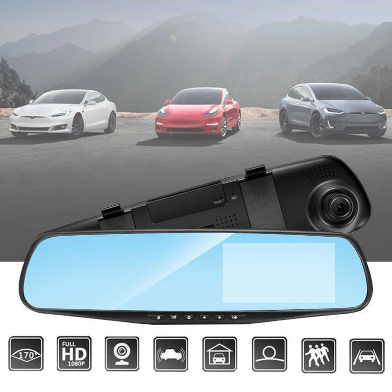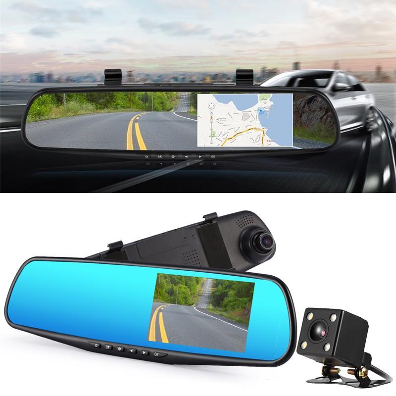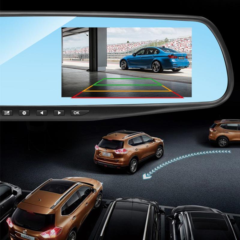 Auto-Rückspiegel, der Recorder-Doppeltes vor und nach der Aufnahme mit dem Umkehren des Bild-Bandes fährt
