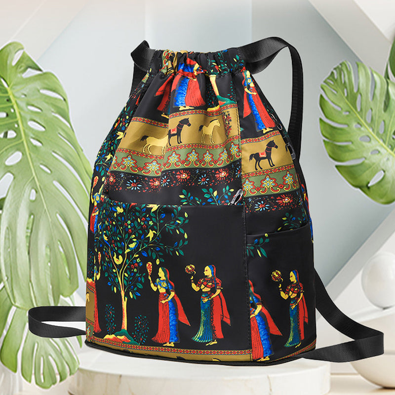 • Kordelzugverschluss: Der Rucksack verfügt über einen praktischen Kordelzugverschluss, der es Ihnen ermöglicht, schnell und einfach auf Ihre Sachen zuzugreifen. Ziehen Sie einfach an den Kordelzügen, um den Beutel mühelos zu verschließen oder zu öffnen.