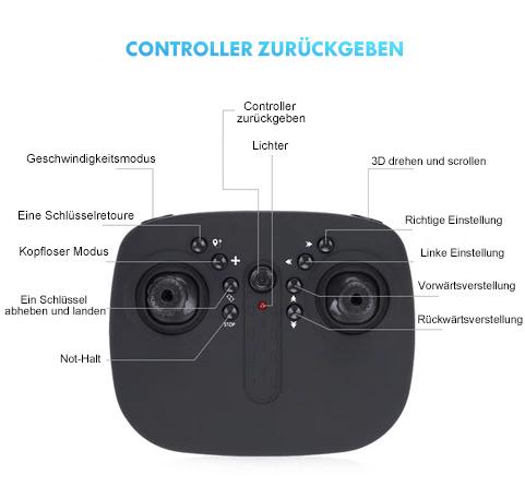 • Kopfloser Modus: Richtet den Flug des Quadcopters auf dem Controller aus. Keine Sorge mehr, dass die Drohne außer Kontrolle gerät